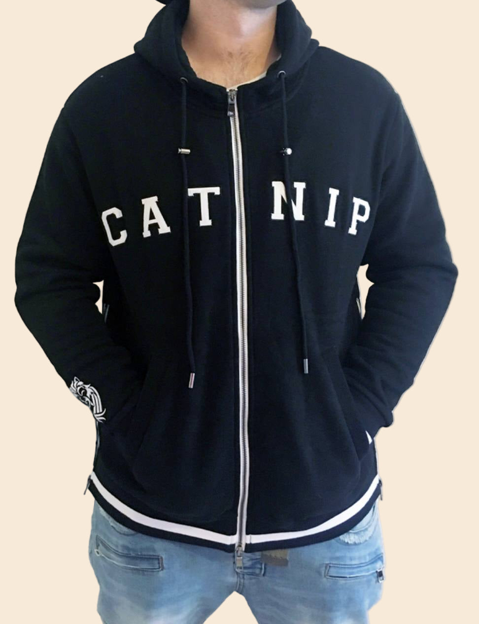 100% cotton black hoodie with white 'catnip' embroidery in an XL